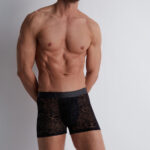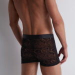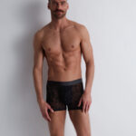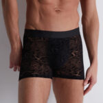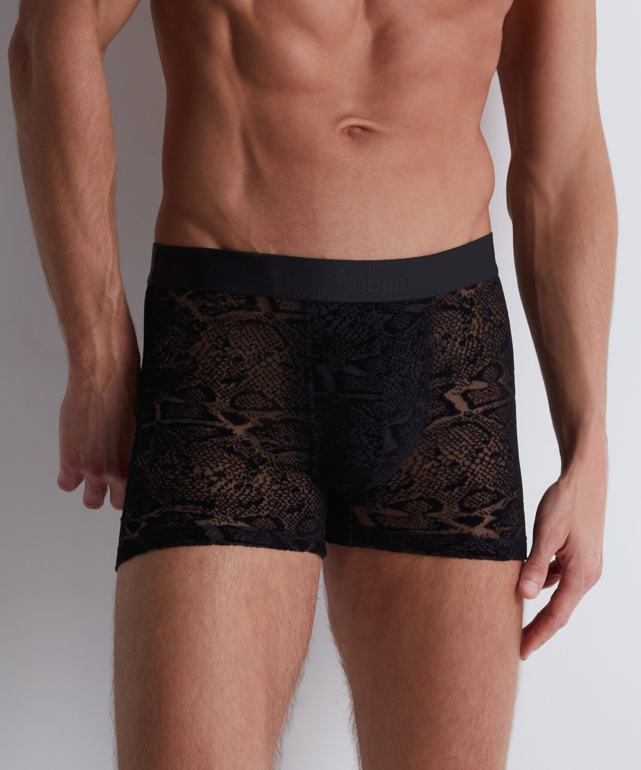 Arborant un motif peau de serpent sur un tulle transparent très doux, le boxer Black Python de la collection Aubade Homme allie séduction et confort dans un modèle original.