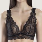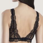 Ce soutien-gorge triangle offre une forme très mode d’un raffinement exquis. Les dentelles dessinent un triangle de broderies délicates où une écaille s’ajoute pour sublimer le dessin floral. Depuis le haut des épaules jusqu’à la courbure des seins, cette pièce sans armature promet une légèreté sans pareille. • Triangle sans armatures •Décolleté plongeant • Laize et galon en dentelle lycra • Nœud satin