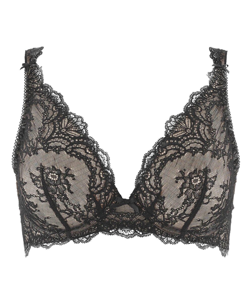 Le soutien-gorge Triangle Plunge dessine un décolleté profond adapté aux poitrines généreuses. La dentelle dessine délicatement ses écailles fleuries sur la courbe de la poitrine, rehaussée de deux petits nœuds de satin délicats aux bretelles. L’ensemble offre séduction et légèreté. • Forme triangle avec armatures • Galon dentelle lycra • Laize dentelle lycra • Noeud satin • Dos renforcé à partir du bonnet E