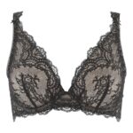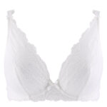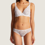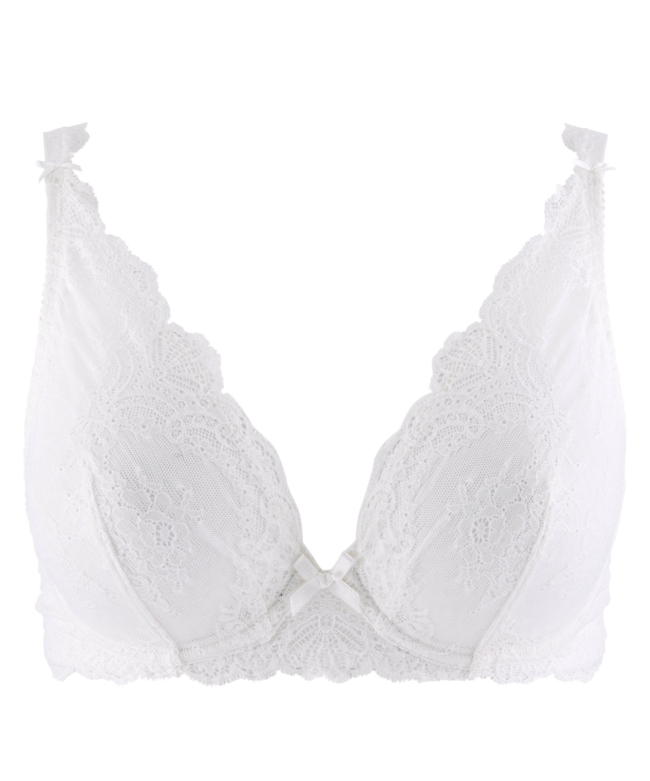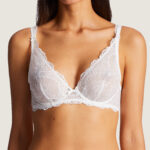 Le soutien-gorge Triangle Plunge dessine un décolleté profond adapté aux poitrines généreuses. La dentelle dessine délicatement ses écailles fleuries sur la courbe de la poitrine, rehaussée de deux petits nœuds de satin délicats aux bretelles. L’ensemble offre séduction et légèreté. • Forme triangle avec armatures • Galon dentelle lycra • Laize dentelle lycra • Noeud satin • Dos renforcé à partir du bonnet E