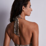 À l’entregorge, une découpe originale et moderne surmontée par un anneau brillant dévoile sensuellement la peau.
