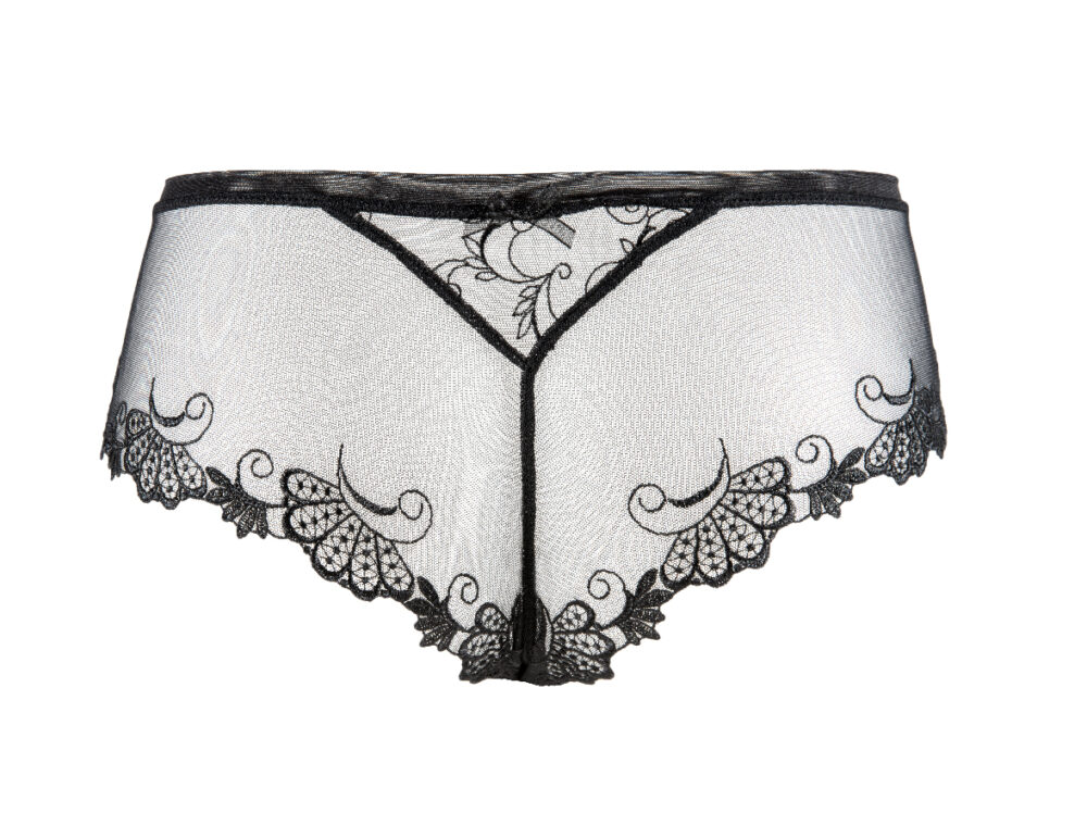 Shorty en tulle taille basse découvrant légèrement les fesses. Ce shorty emboîte les côtés grâce à ses empiècements de guipure effet tatoo. Délicat nœud en organza situé au milieu du dos.