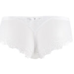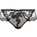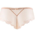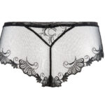 Shorty en tulle taille basse découvrant légèrement les fesses. Ce shorty emboîte les côtés grâce à ses empiècements de guipure effet tatoo. Délicat nœud en organza situé au milieu du dos.