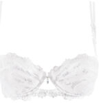 Soutien-gorge corbeille souple à armature à la découpe horizontale. Ce soutien-gorge offre un décolleté arrondi tout en féminité. Fines bretelles spaghettis réglables pour davantage de féminité et de légèreté. Empiècements de guipure effet tatoo sur les bonnets et au dos. Délicat pendentif Swarovski situé à l’entre-seins.