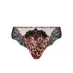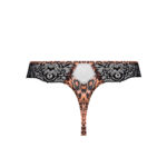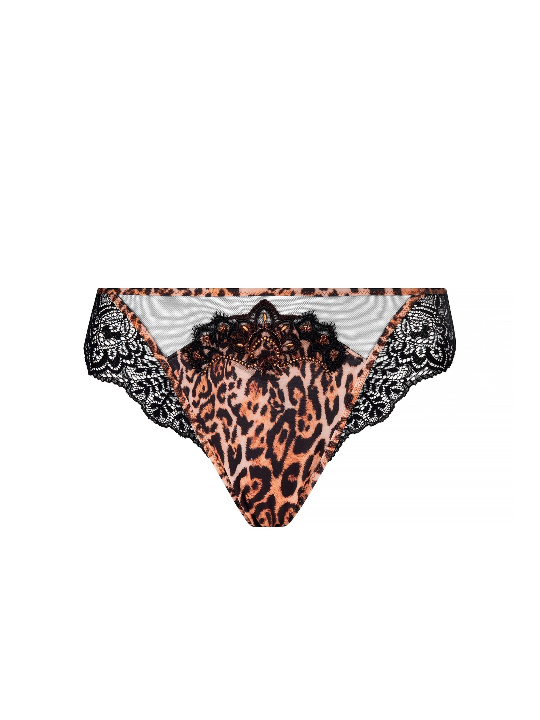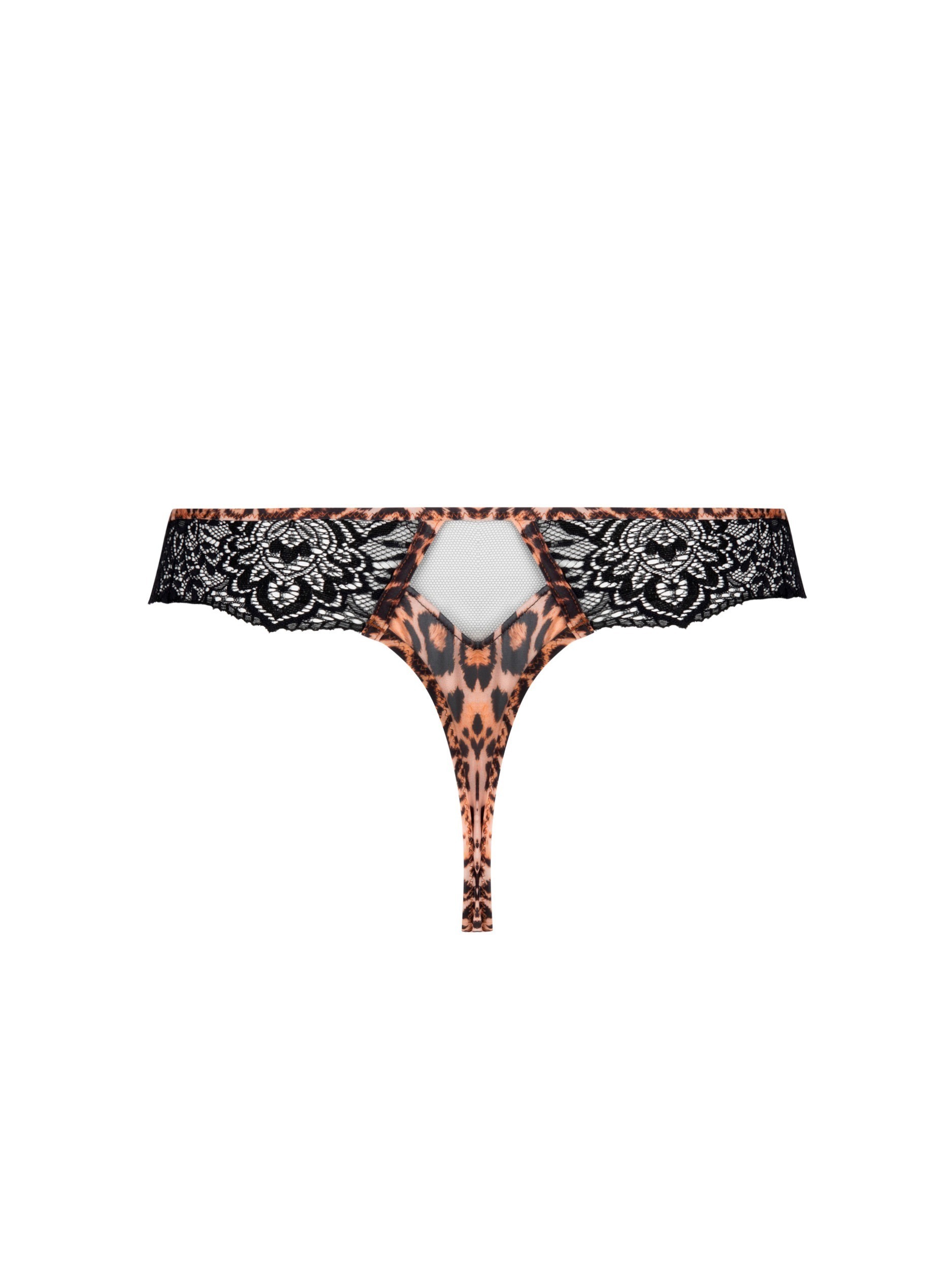Ce string en maille imprimée fauve est agrémenté d’un empiècement en tulle et d’un motif placé sur le devant.