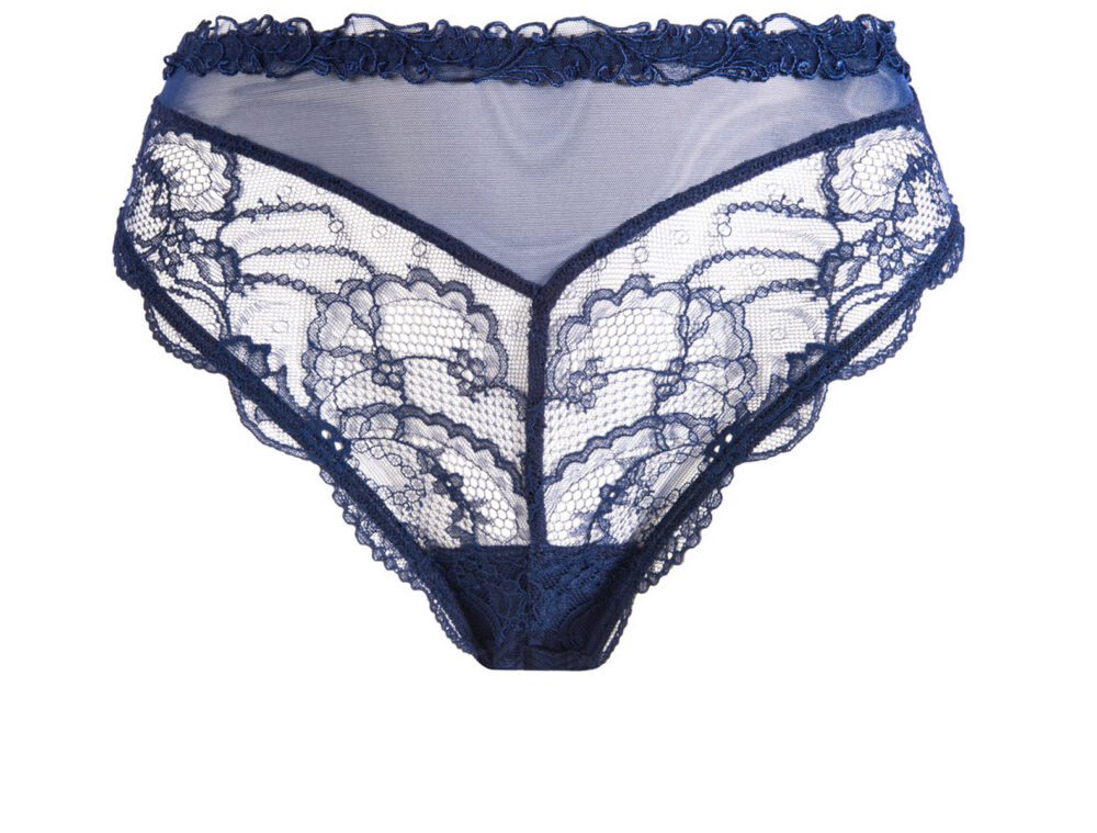Slip en dentelle de Calais orné d’un galon brodé. Gainant sur le devant pour un effet ventre plat. Ce slip est emboîtant dans le dos et large sur les côtés pour un maximum de confort au porter. Empiècements en tulle