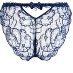 Slip en dentelle de Calais échancré sur le devant. Ce slip dégage la cuisse et découvre la mi-fesse avec sensualité. Galon brodé. Délicat nœud de satin et masque avec strass Swarovski situés au milieu du dos.