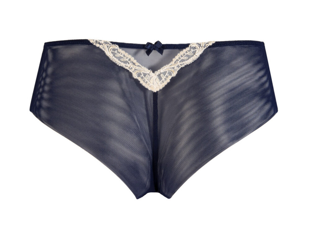 Shorty taille basse découvrant légèrement la fesse. Ce shorty emboîte les côtés grâce à ses empiècements en tulle brodé. Devant en satin de Soie. Dos en tulle plié en deux pour davantage d’invisibilité. Délicat noeud de satin situé au milieu du dos.
