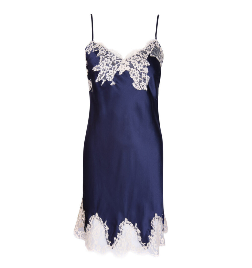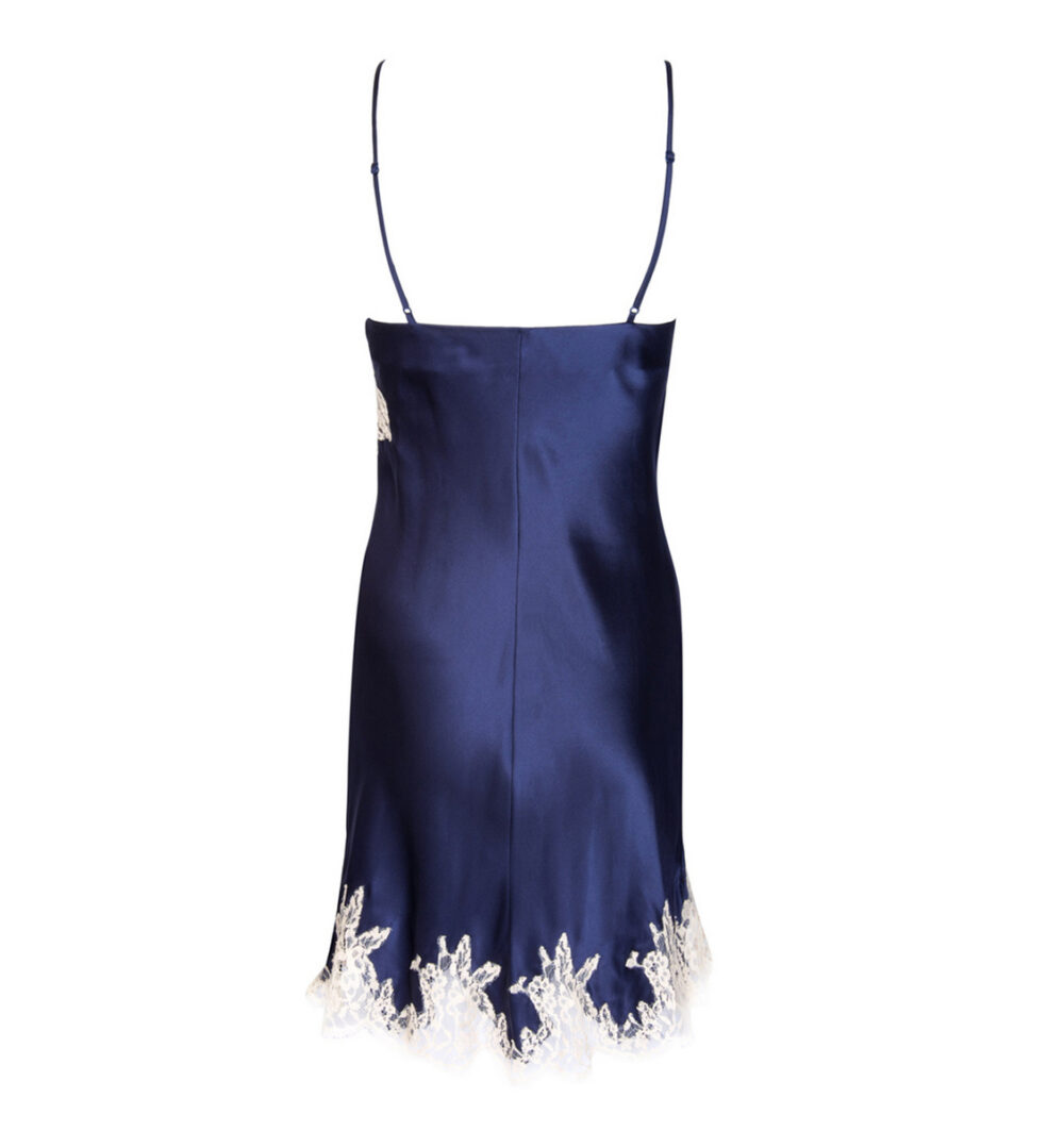 Nuisette charme légèrement évasée sur le bas avec une longueur au dessus du genou. Fines bretelles en satin de Soie. Finitions dentelle de Calais au décolleté et sur la partie basse.