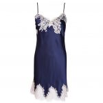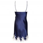 Nuisette charme légèrement évasée sur le bas avec une longueur au dessus du genou. Fines bretelles en satin de Soie. Finitions dentelle de Calais au décolleté et sur la partie basse.