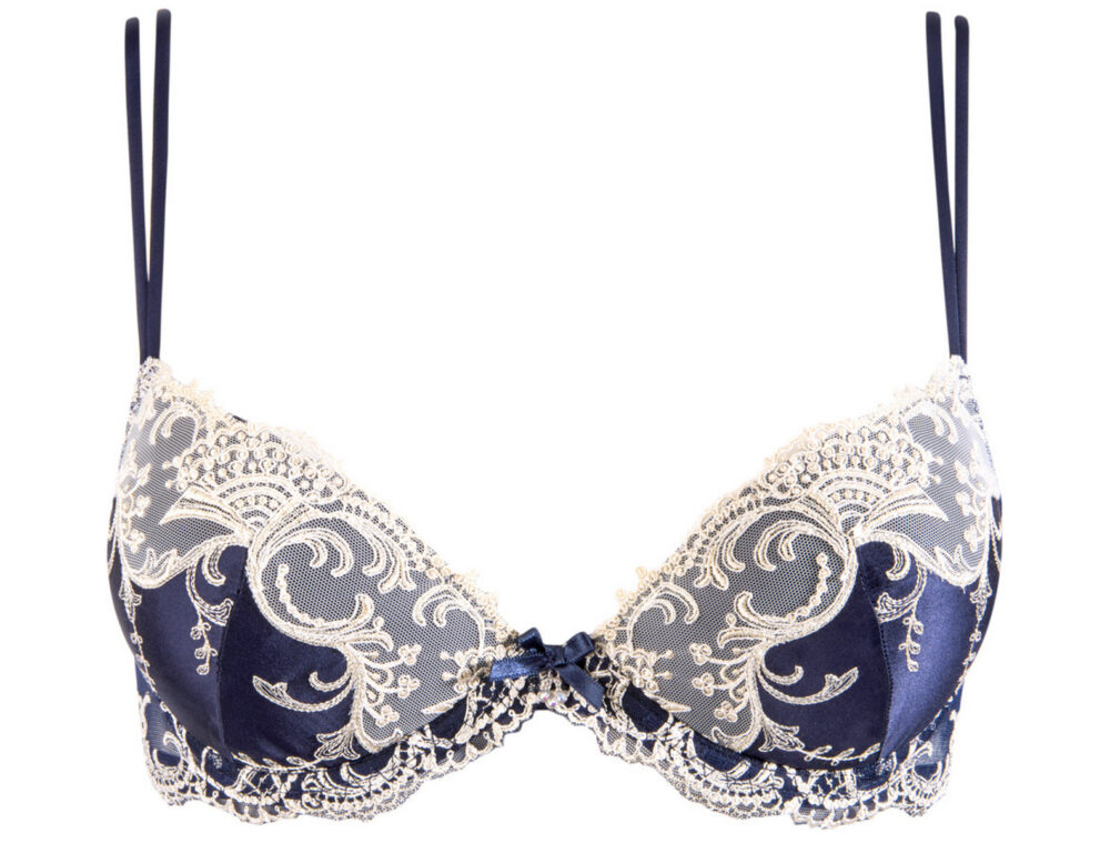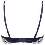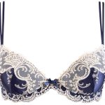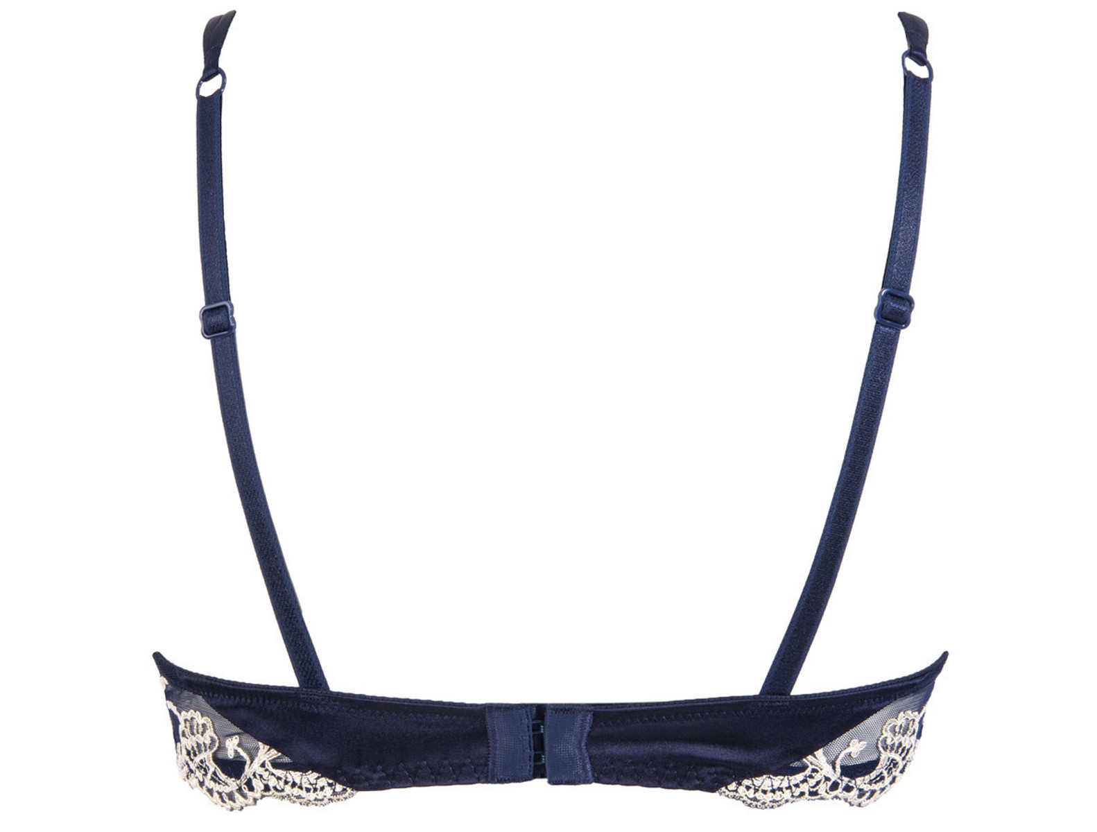 Soutien-gorge coque à armature. Ce soutien-gorge offre une poitrine galbée et arrondie. Bonnets en satin de Soie incrusté d’une broderie sur tulle. Fines bretelles spaghettis réglables pour davantage de légèreté et de féminité. Dos en tulle brodé. Délicat nœud de satin et bijou avec strass Swarovski situés à l’entre-seins.