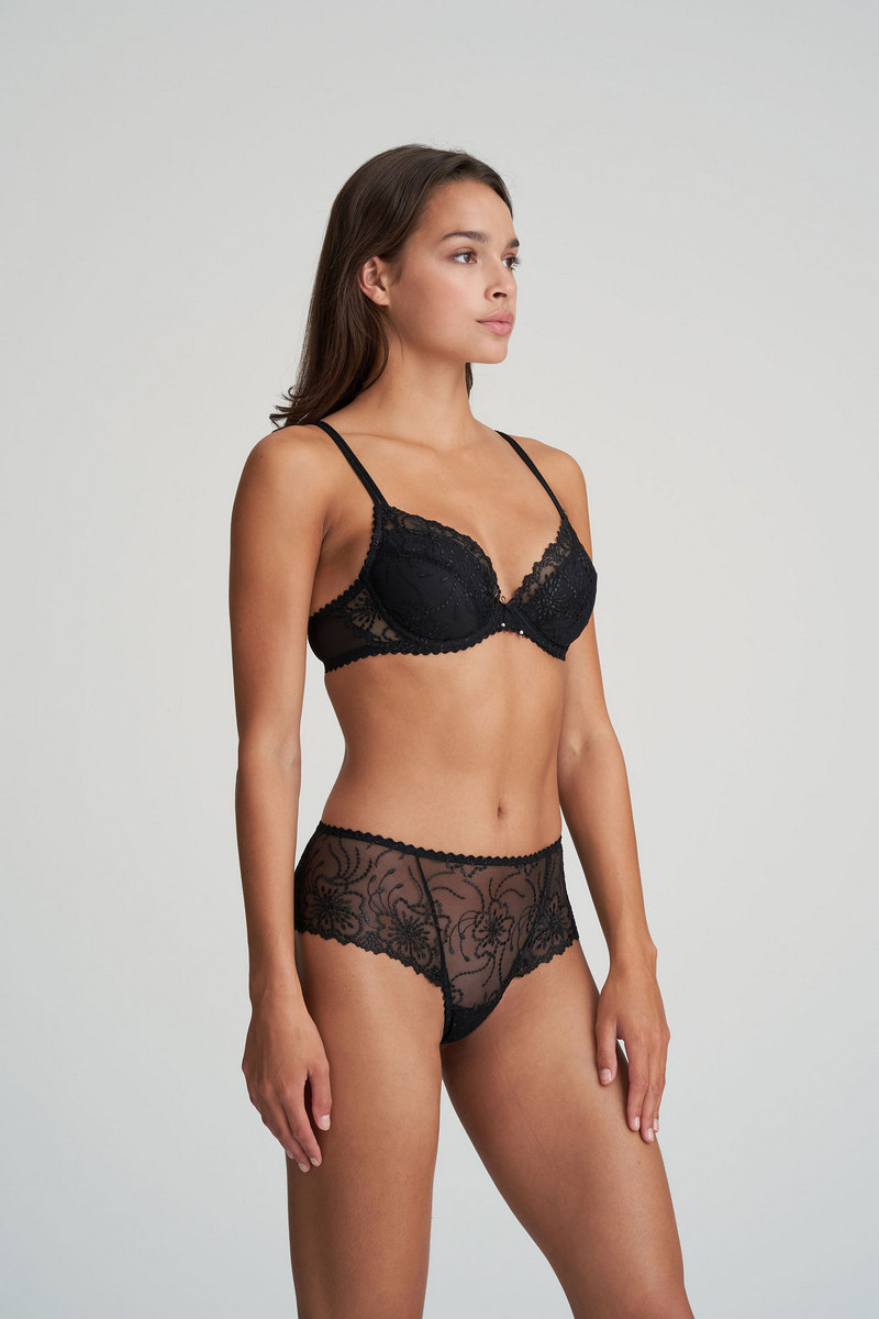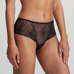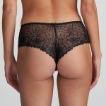 Le string de luxe est plus large sur le devant et descend à mi-fesses dans le dos. Modèle sensuel et sexy, entièrement réalisé en broderie transparente.