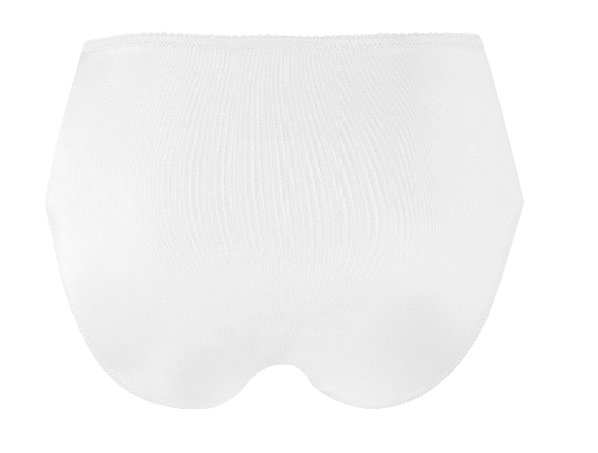 Tummy control high waist, full coverage to the backside. Comfortable and sculpting. Embroidered front, scalloped thighs. Mesh back with drop and organza bow.