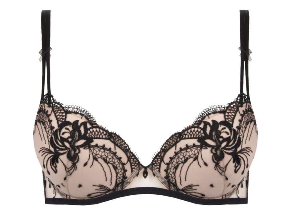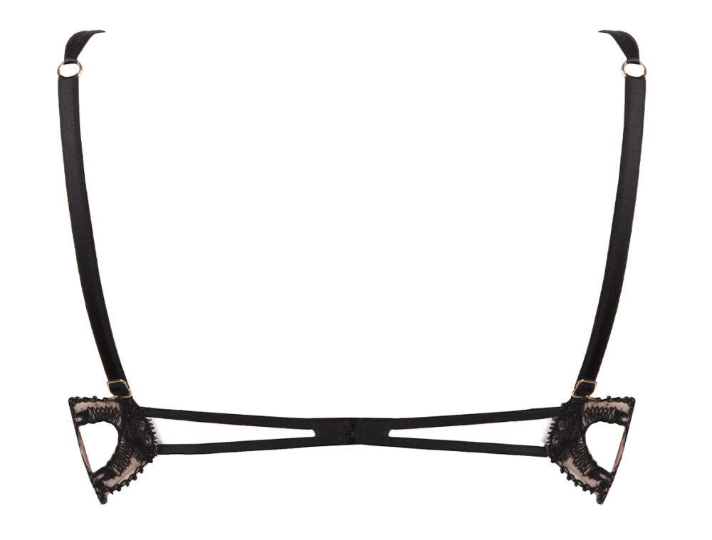 Embroidered cups on invisible tulle scalloped at the neckline. Invisible tulle cleavage highlighted by black bias. Back with openwork embroidered motifs. Double straps embellished with a chiffon bow. Black stone jewel.