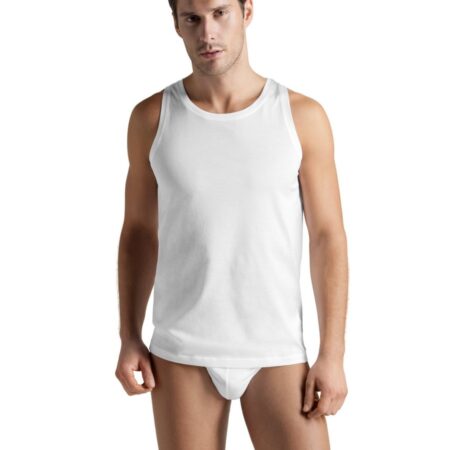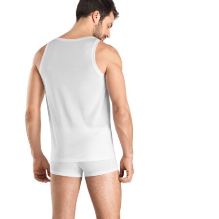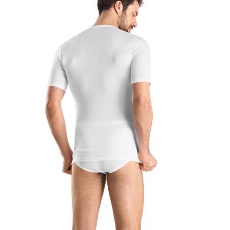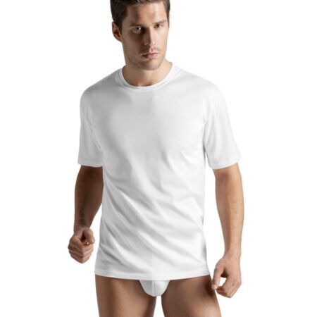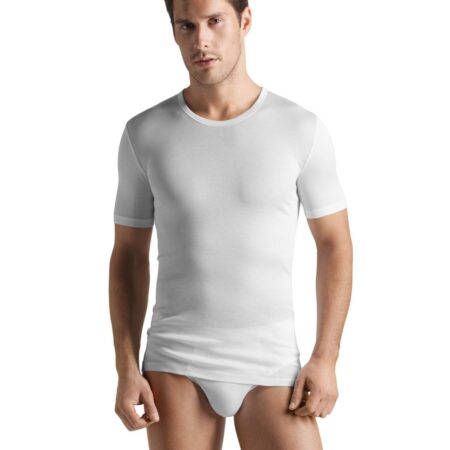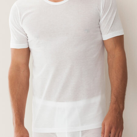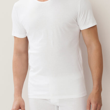 Tout en finesse et sobriété: le jersey simple en coton traité est soyeux et légèrement transparent. Travaillé à la main, il se décline en maillot de corps, très absorbant et qui sèche rapidement.