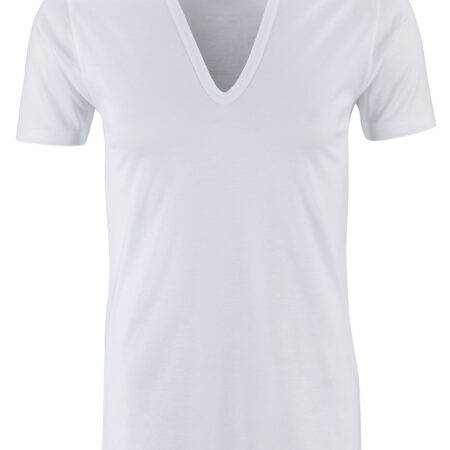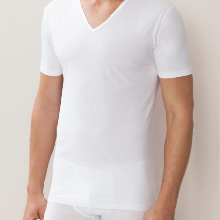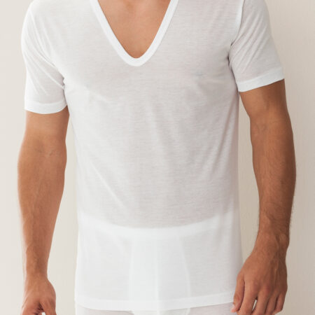 Tout en finesse et sobriété: le jersey simple en coton traité est soyeux et légèrement transparent. Travaillé à la main, il se décline en T-shirt à col V arrondie, très absorbant et qui sèche rapidement.